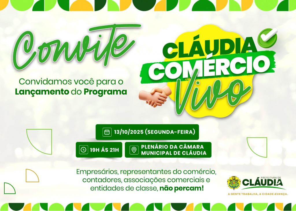 A Prefeitura de Cláudia lança, na próxima segunda-feira, 13 de outubro, às 19h, no Plenário da Câmara Municipal, o Programa “Cláudia Comércio Vivo”, uma iniciativa que conecta os empreendedores locais às oportunidades de fornecimento de bens e serviços para o município. O programa marca uma nova etapa na relação entre o poder público e o […]
